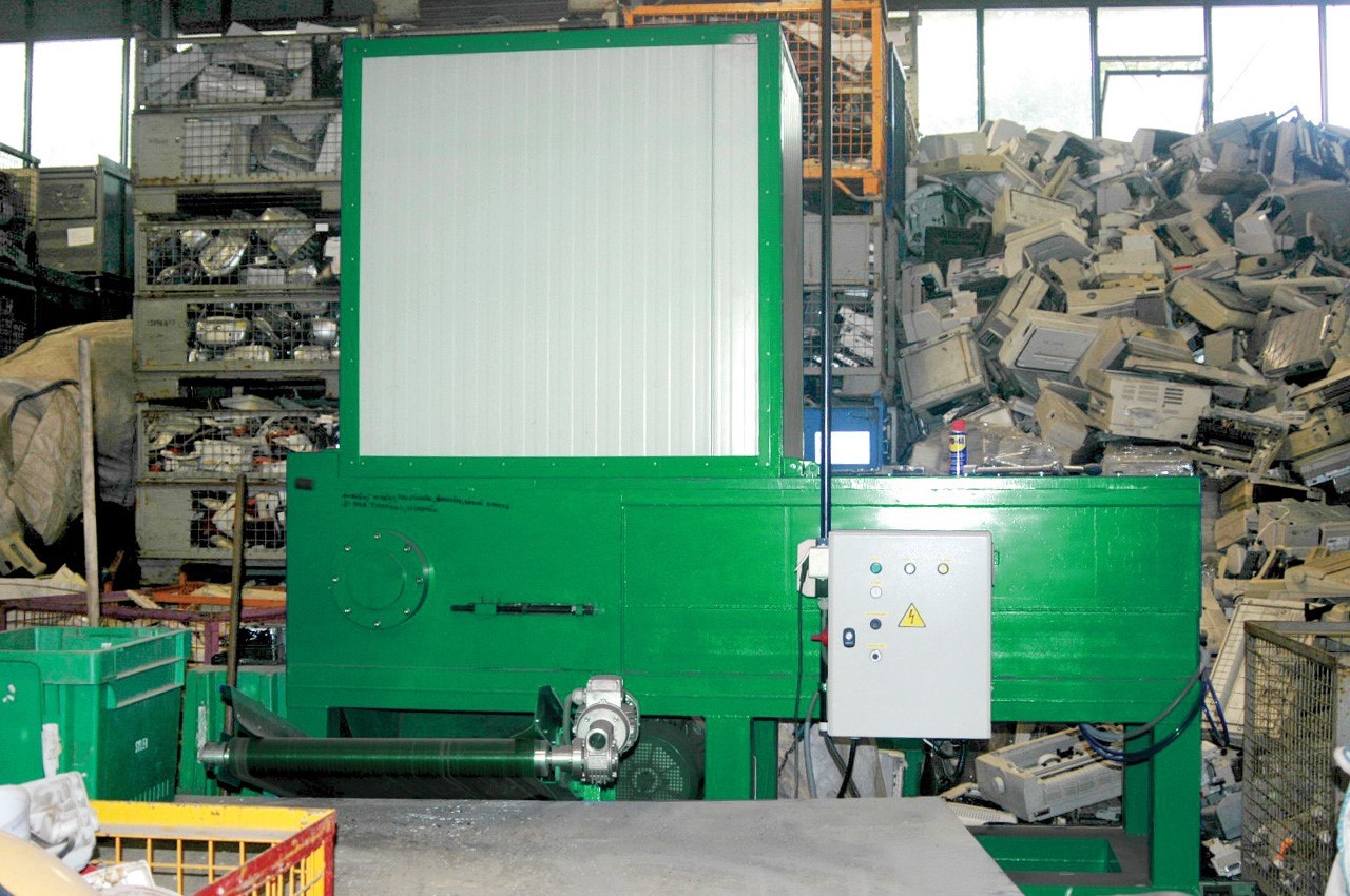 A hybrid shredder is a machine used for very fine crushing in waste sorting facilities, and waste sorting lines, especially in electronic waste processing lines (frames of televisions, computers, tuners, video sets, telephones, etc.). It is designed as a combination of a single-shaft shredder and a hammer mill, in which the hammers crush the electronic waste into large pieces using a movable stator blade. The blade can be adjusted according to the required output size. The output is 200–300mm pieces of waste.