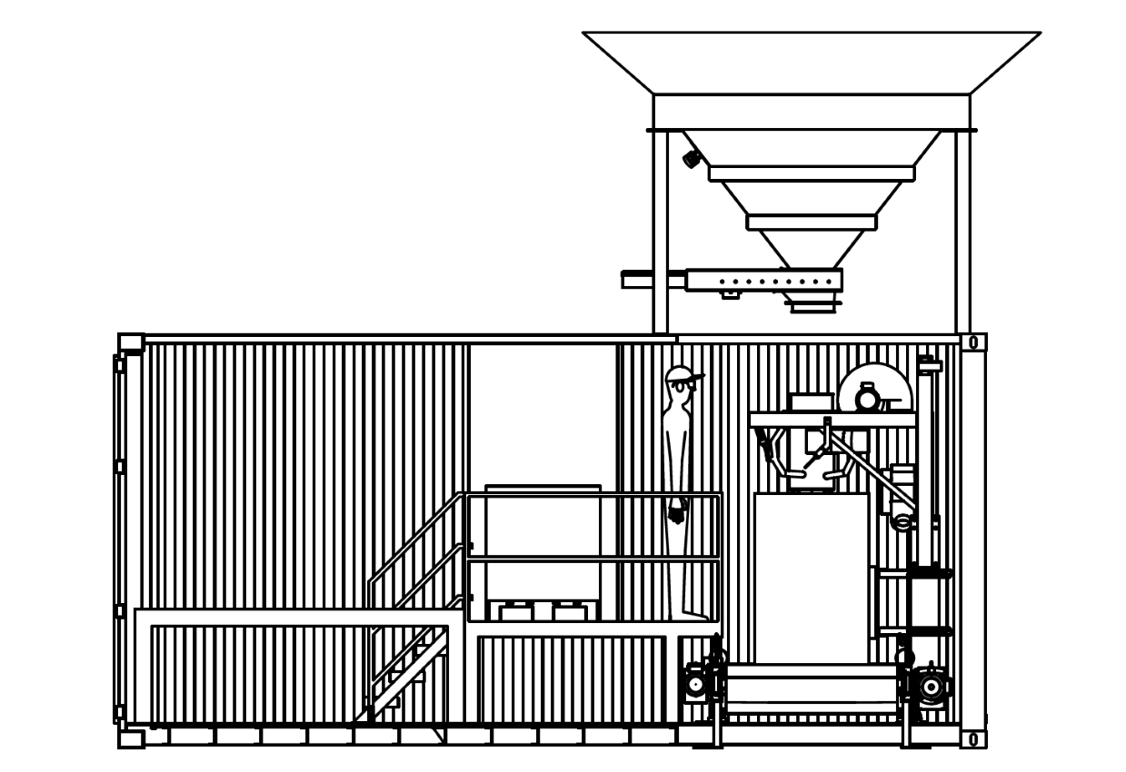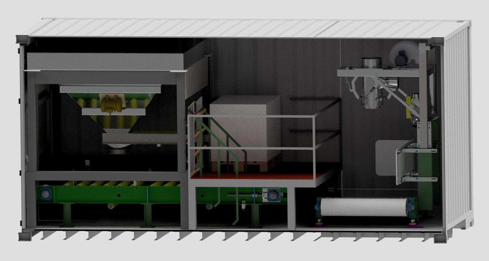 В транспортном режиме все помещено в один 20-футовый контейнер, который защищен от кражи или повреждения техники. При сборке Накопительной бункер помещен поверх Контейнера на любой плоской бетонной поверхности и отводящий транспортер перемещен из Контейнера (транспортный режим) и прицеплен к фасовочному оборудованию вне Контейнера с отводом на улицу.