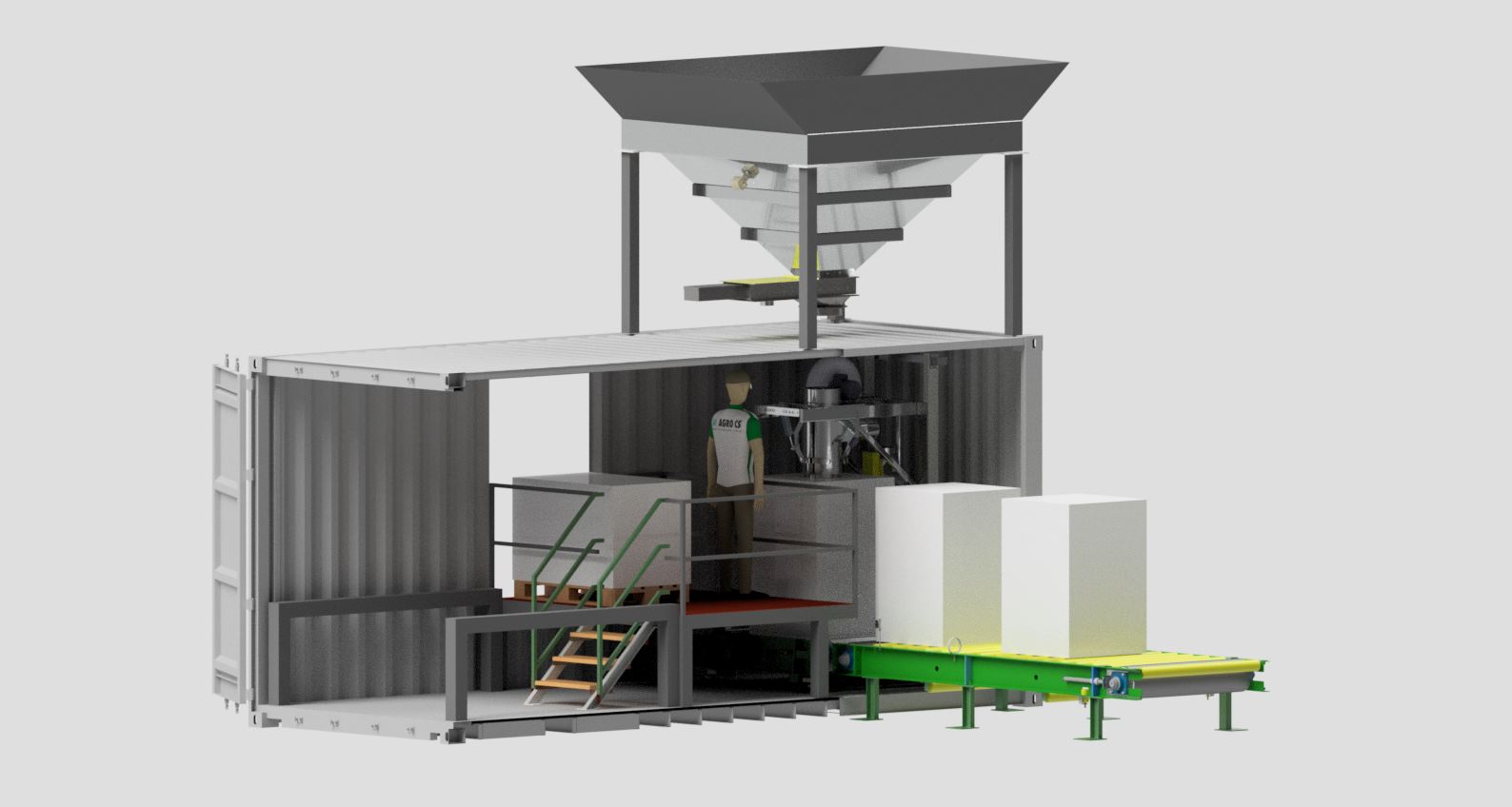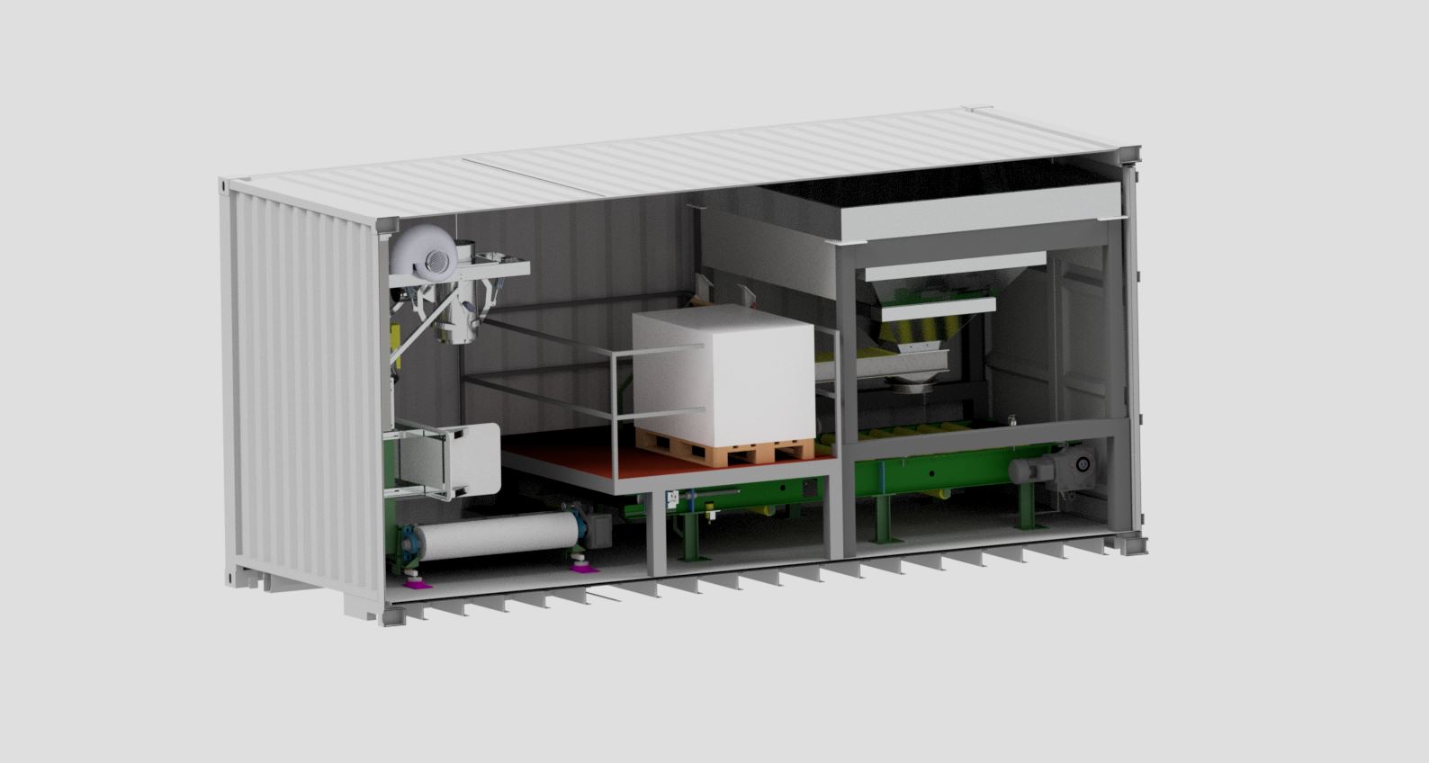 Технология представляет собой мобильный вариант Упаковочного оборудования для мягких контейнеров, предназначена для размещения на любом вымощенном месте и обеспечивает фасовку гранулированных минеральных удобрение в мягкие контейнеры – биг-беги. Технология помещена в 20-футовом контейнере, включая накопительного бункера и отводящего транспортера готовых мягких контейнеров.