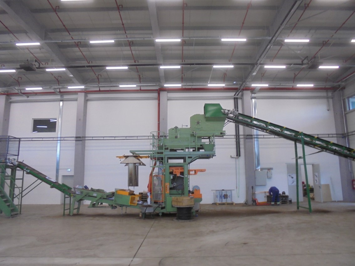 Субстрат, подлежащий упаковке, подается наклонным ленточным конвейером в рабочий бункер упаковочной машины. Несколько упаковочных машин могут быть установлены в линию с путями подачи.