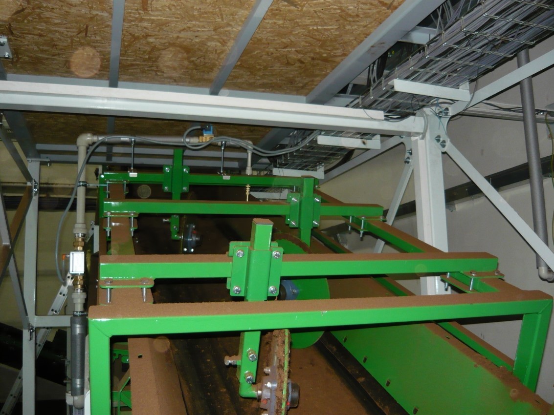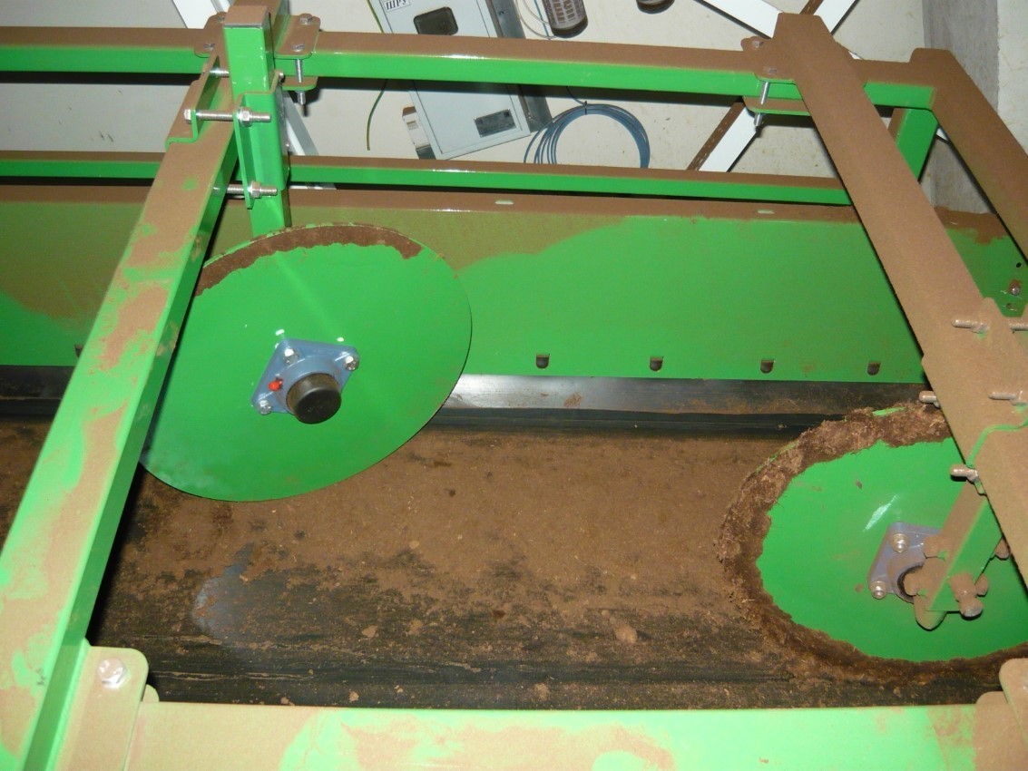 Miešacie kotúče sú umiestnené za sebou kolmo k pásu na pozdĺžnom hriadeli, ktorý ich vedie v smere toku materiálu nad pásovým dopravníkom. Majú za úlohu predmiešanie sendvičovo navrstveného substrátu na páse a tým ho pripraviť na záverečné miešanie.